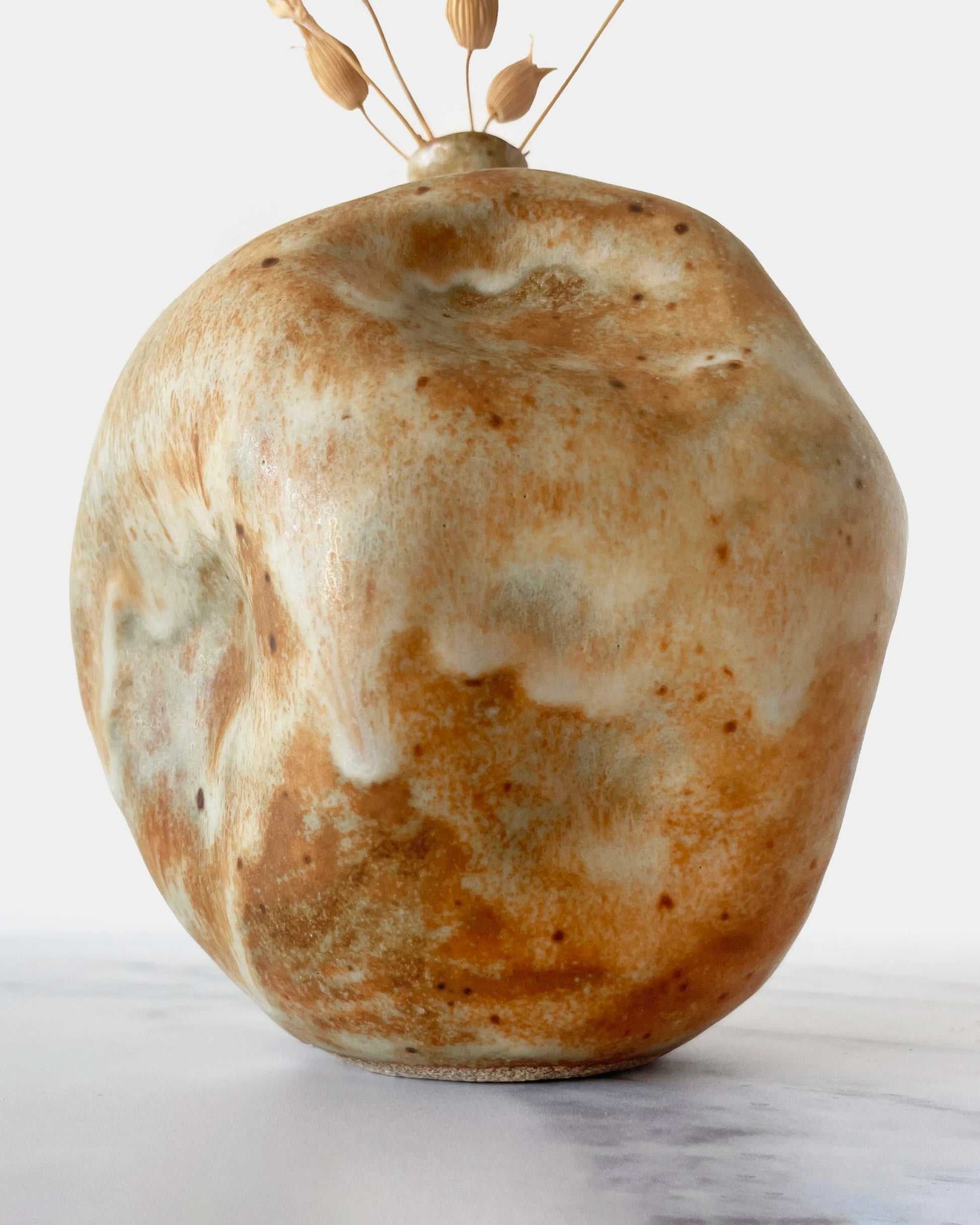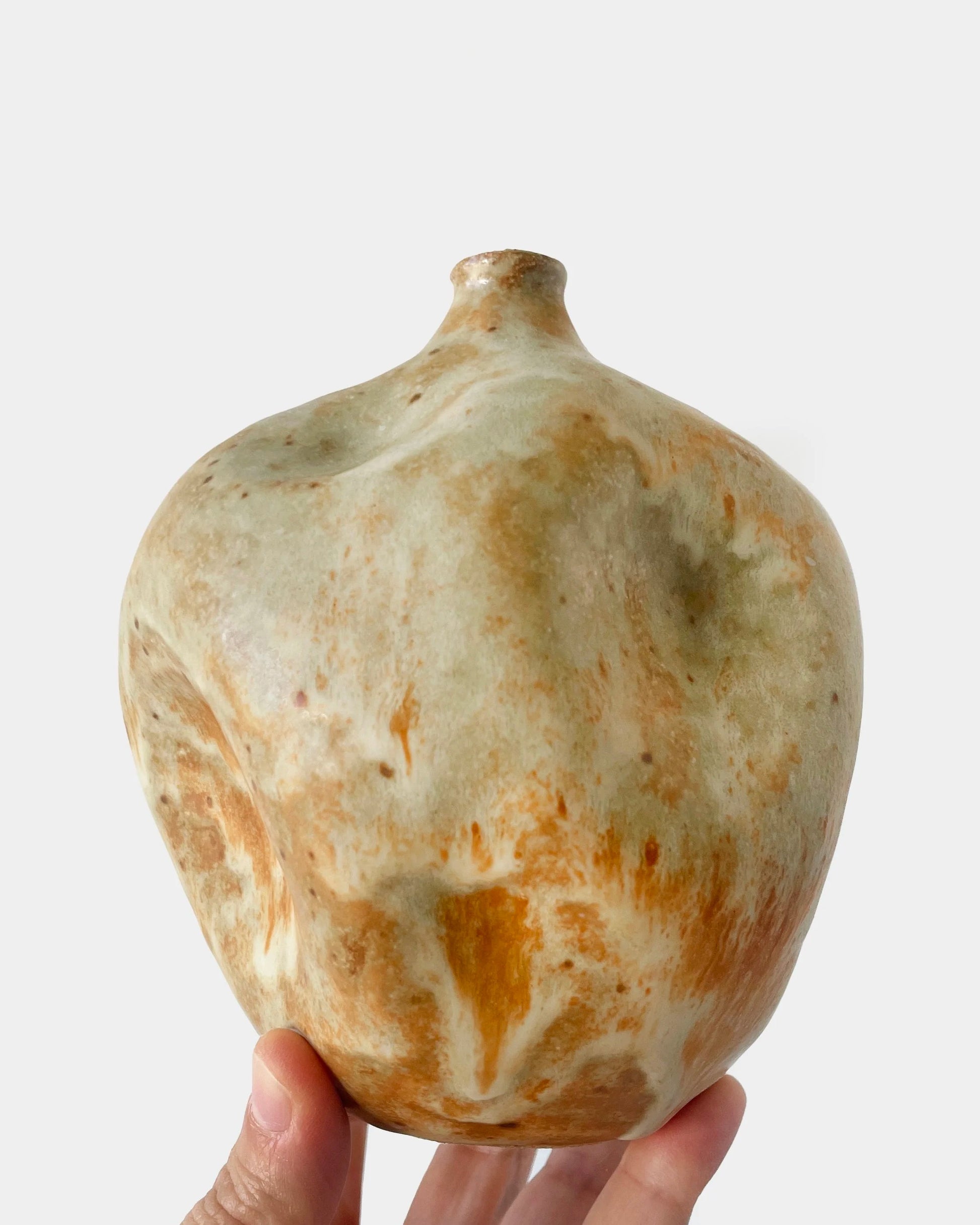 This vessel was indented by hand, creating a soft, organic shape. It’s finished in a matte glaze that was brushed on to create delicate movement and depth in the surface. Perfectly pretty on its own or adorned with a delicate dried stem.