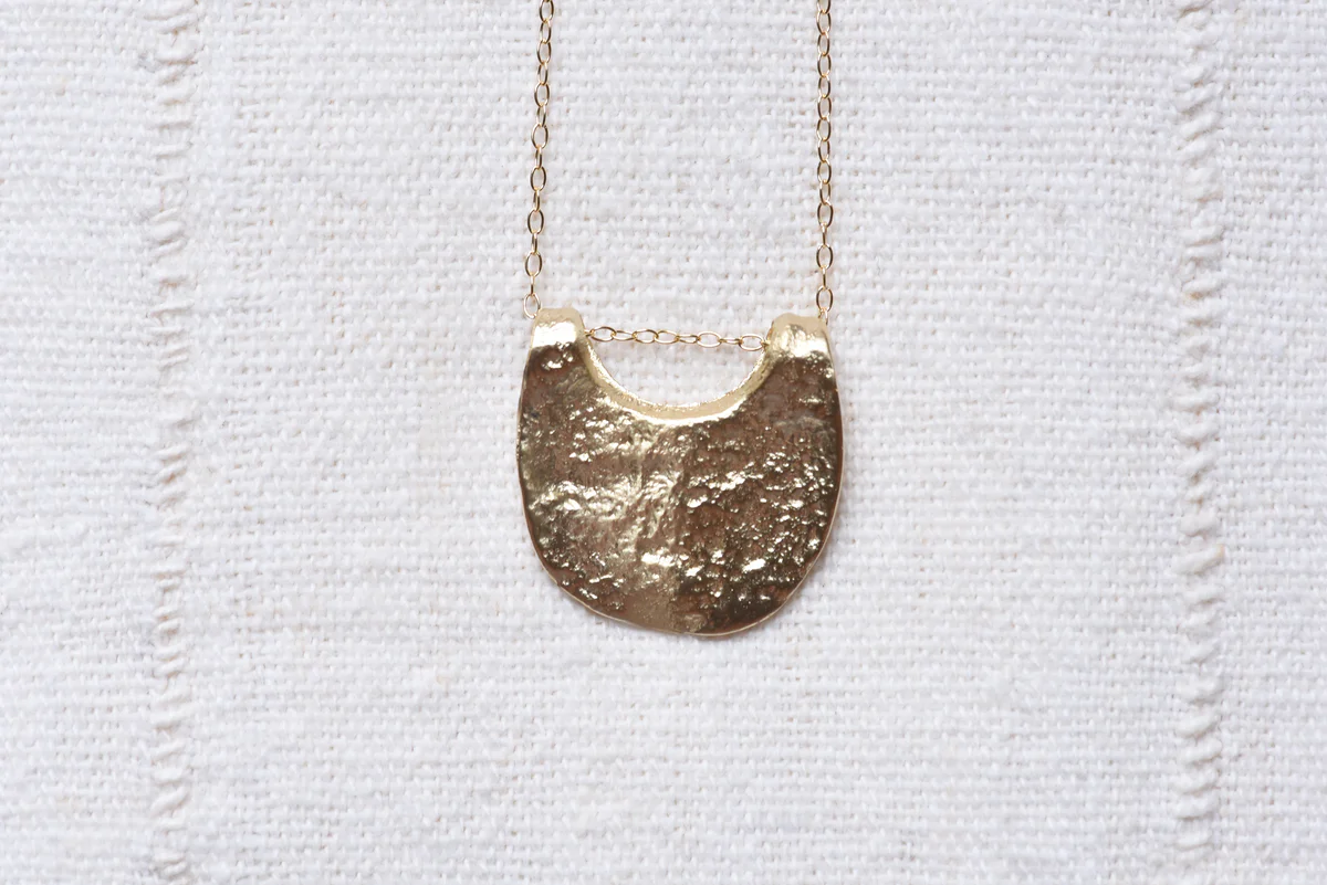 Make any look shine a little brighter with the Golden Moon Necklace. Its shimmering brass pendant is gently hammered to give it some contoured texture and hangs from a gold-filled, 17in delicate chain. Handmade in New York City.