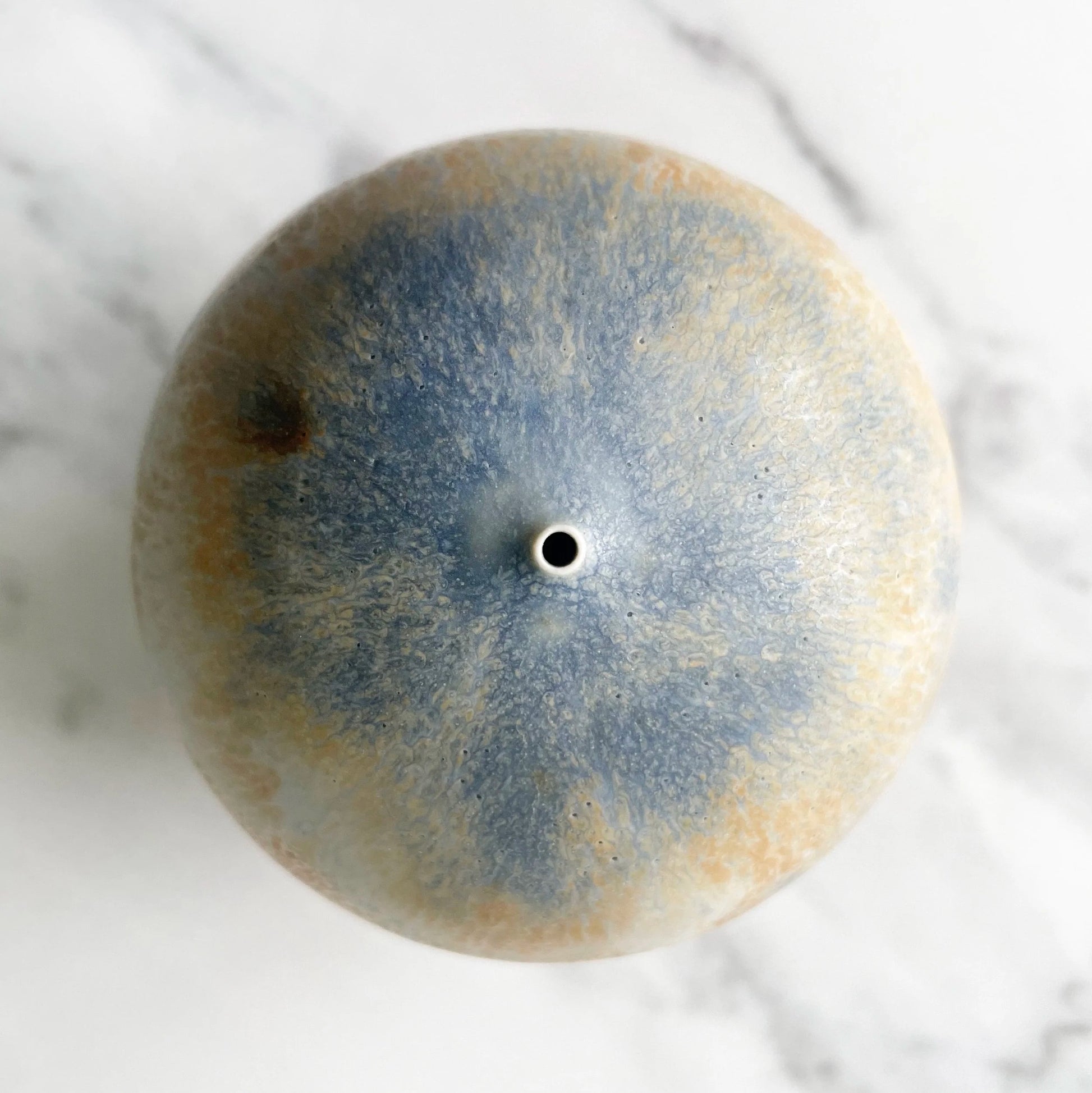 This vessel was wheel-thrown and features a single glaze that shifts from deep rust orange to cool gray-blue. Its tiny opening is just right for a delicate dried stem to complement the stunning coloration.