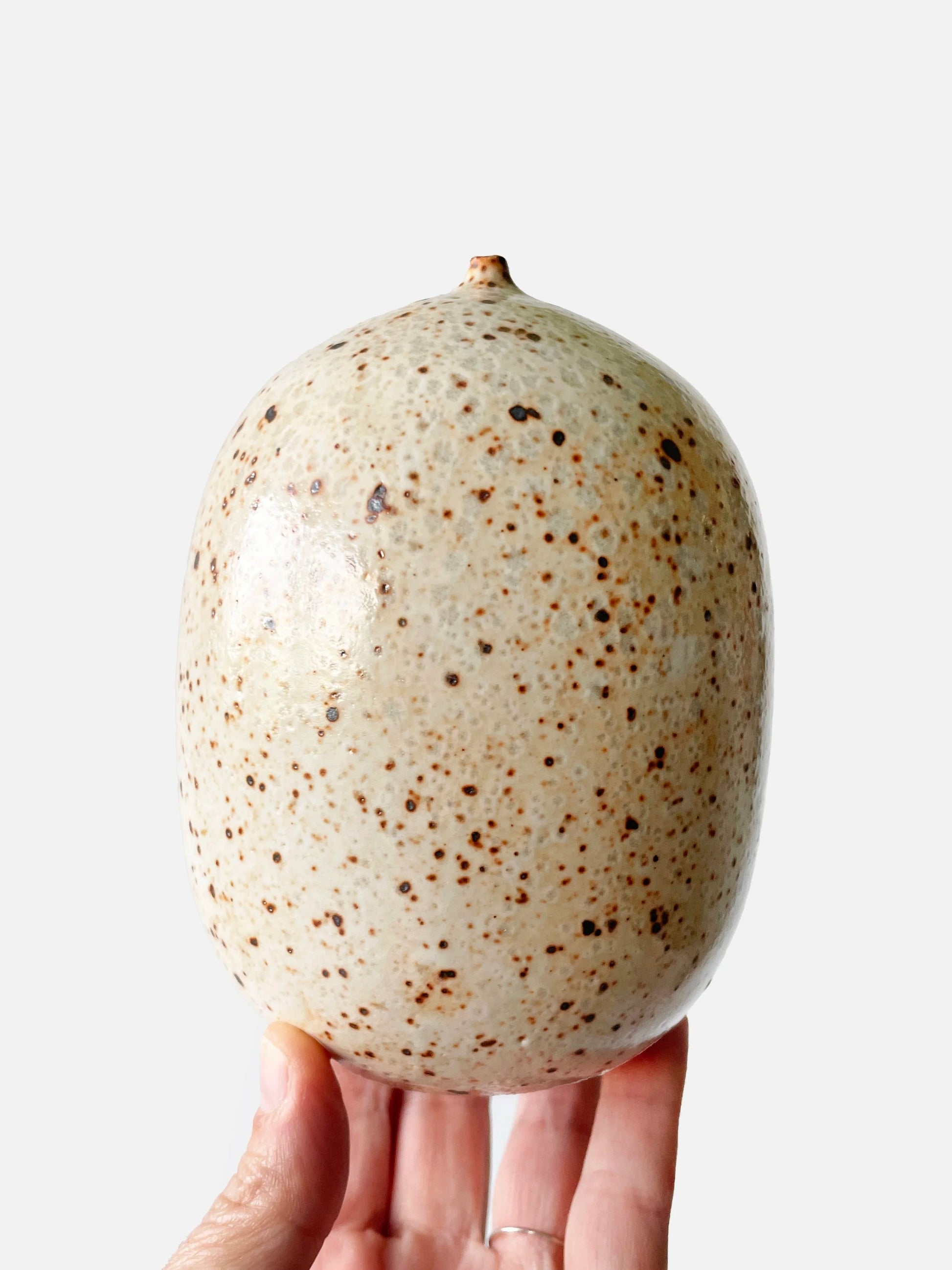 This wheel-thrown vessel features a shino glaze that ranges from soft white to gentle orange. Iron-rich material was added to the clay before throwing to create dark speckles that sprinkle across the surface. Reminds us of an earthy Easter egg with its curved edges, smooth surface, and playful design.