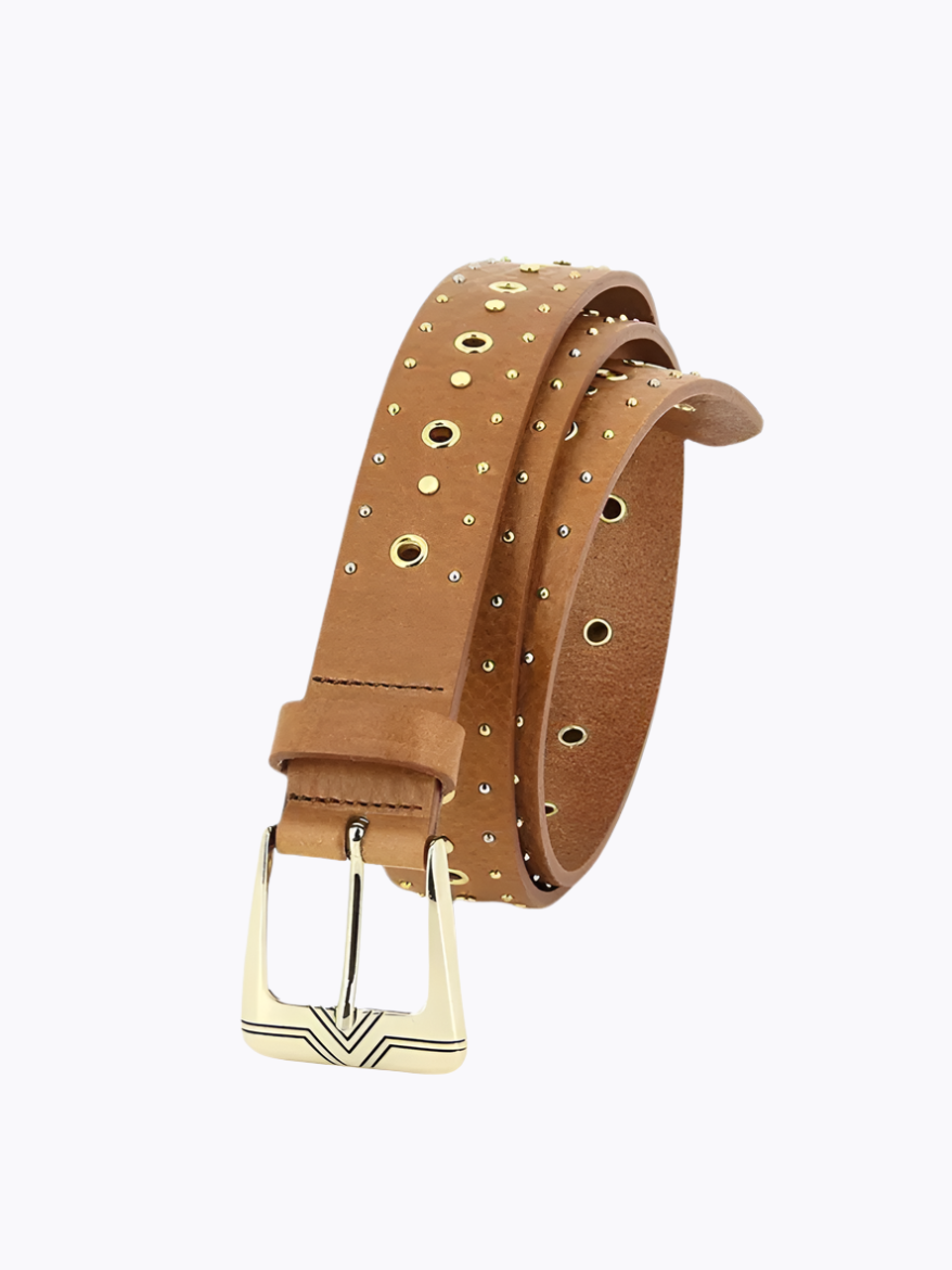 From one of our favorite brands, this Herbert Frère Soeur eye-catching belt is a perfect blend of French sophistication and Texan spirit. It's saddle-colored leather makes it a versatile wardrobe staple, while the gold studs and western-style buckle will add some personality and memorable distinction to any outfit. Made of 100% cowhide leather vegetable tanned for durability and longevity.