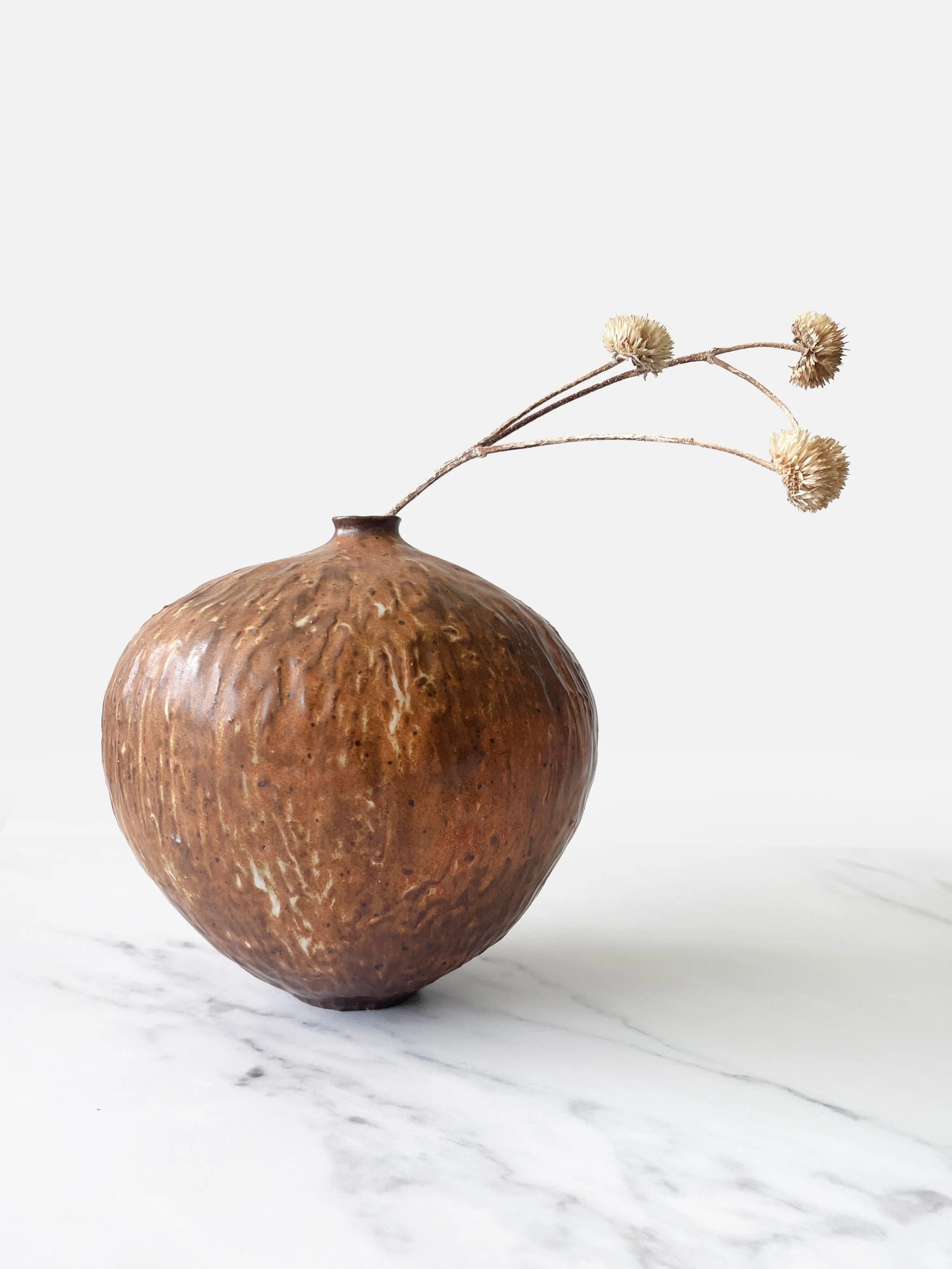 Coil-built with minimal tools, this vessel carries the marks of the artist's hands along its surface. The dark clay turned much of the white glaze tan, leaving a finish that feels rich and natural, with movement in every indentation. Lovely to see, gorgeous to touch.