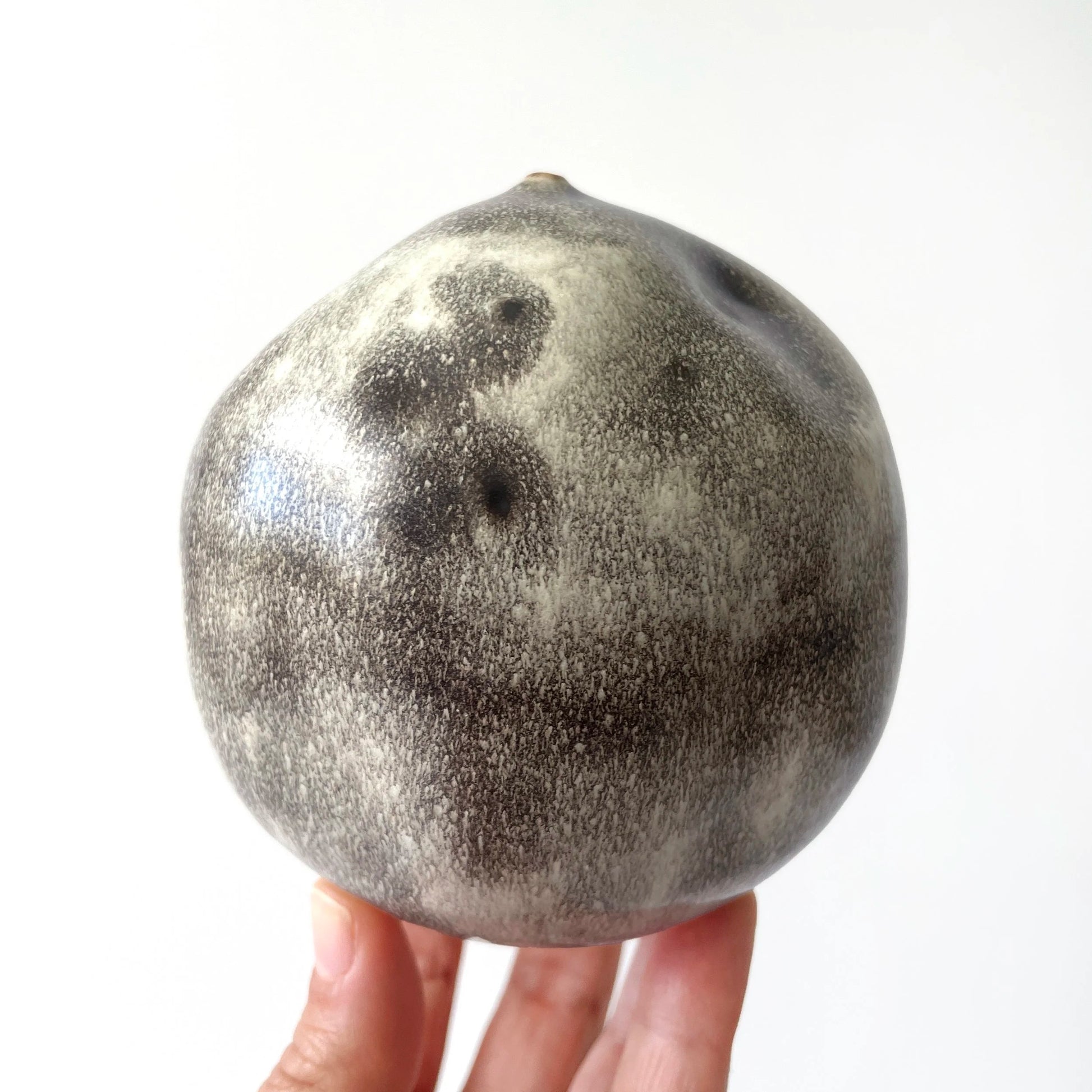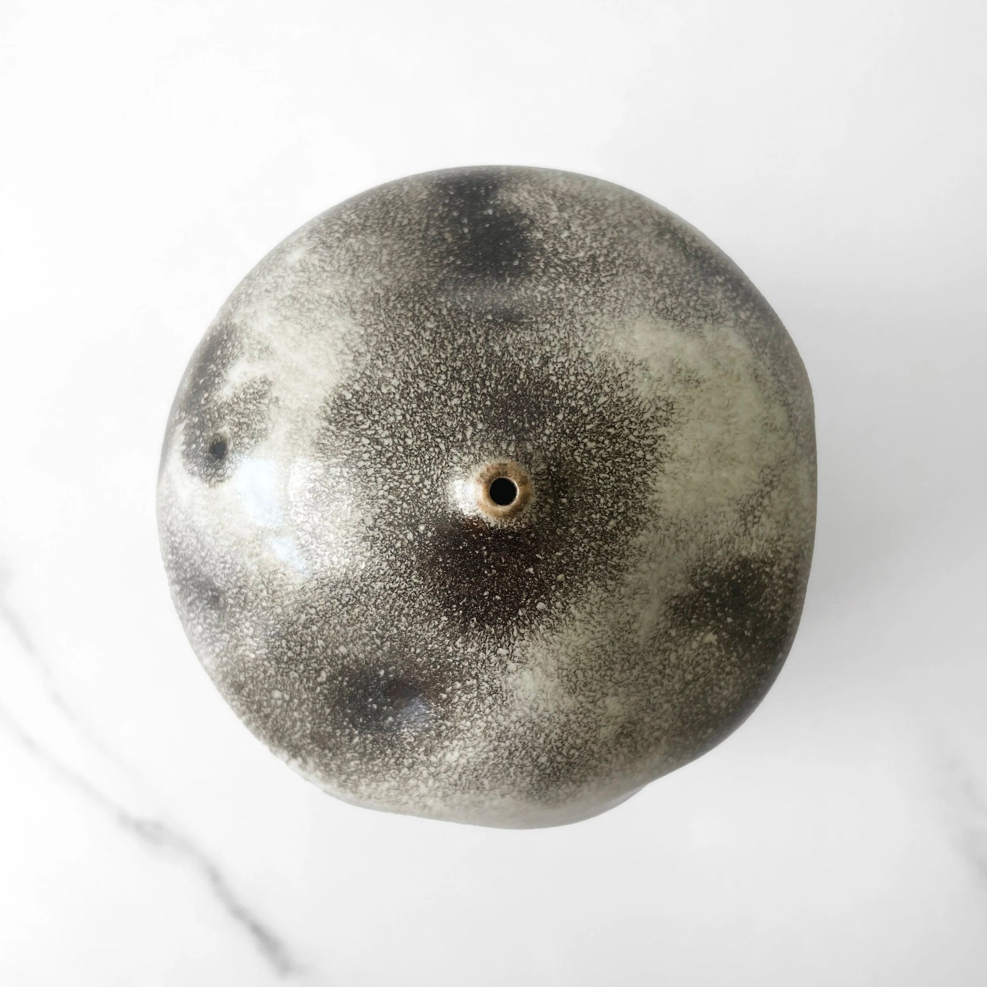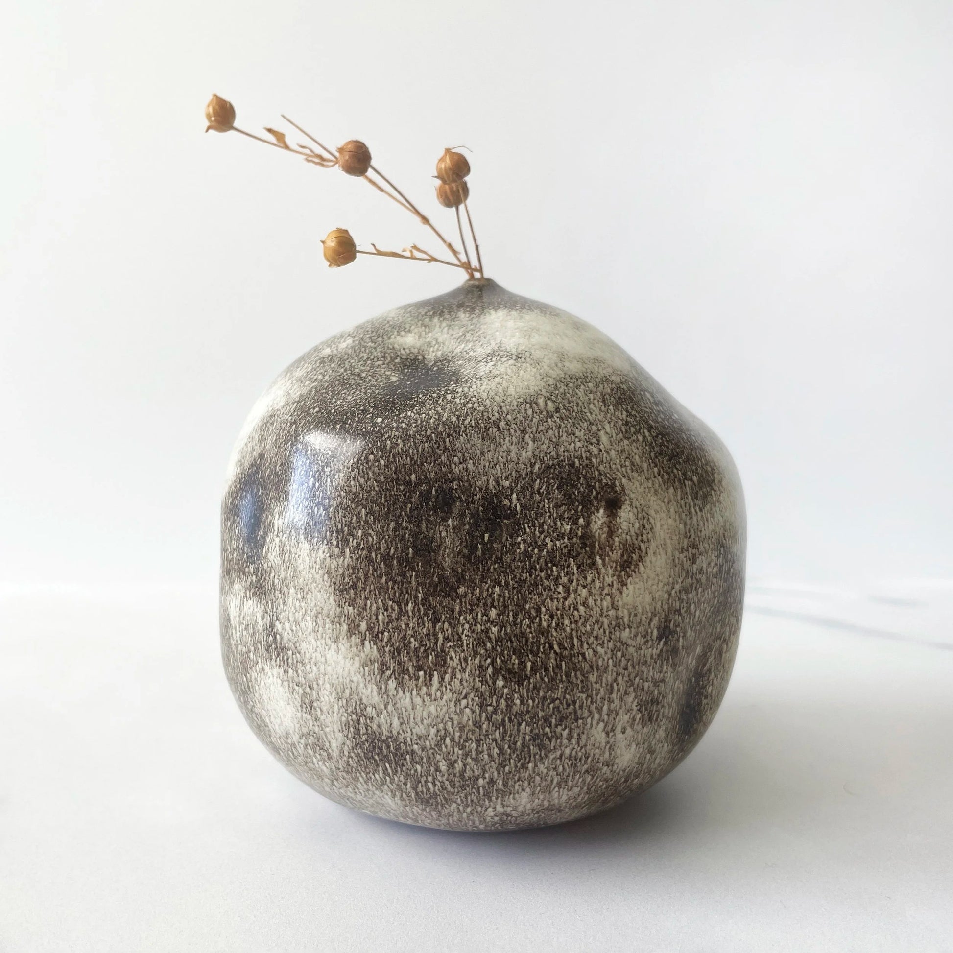 This vessel was wheel-thrown then indented gently by hand, creating a soft organic shape. It’s glazed in two layers, a black base with white over top, that interact in unexpected ways, creating a surface full of movement, depth, and contrast. Perfect on it's own or with a slender dried sprig.